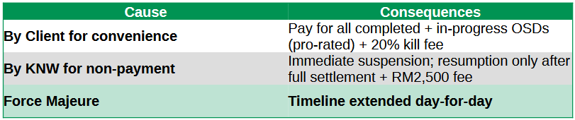 - Any other cancellation: you only pay for completed OSDs + 10% kill fee.